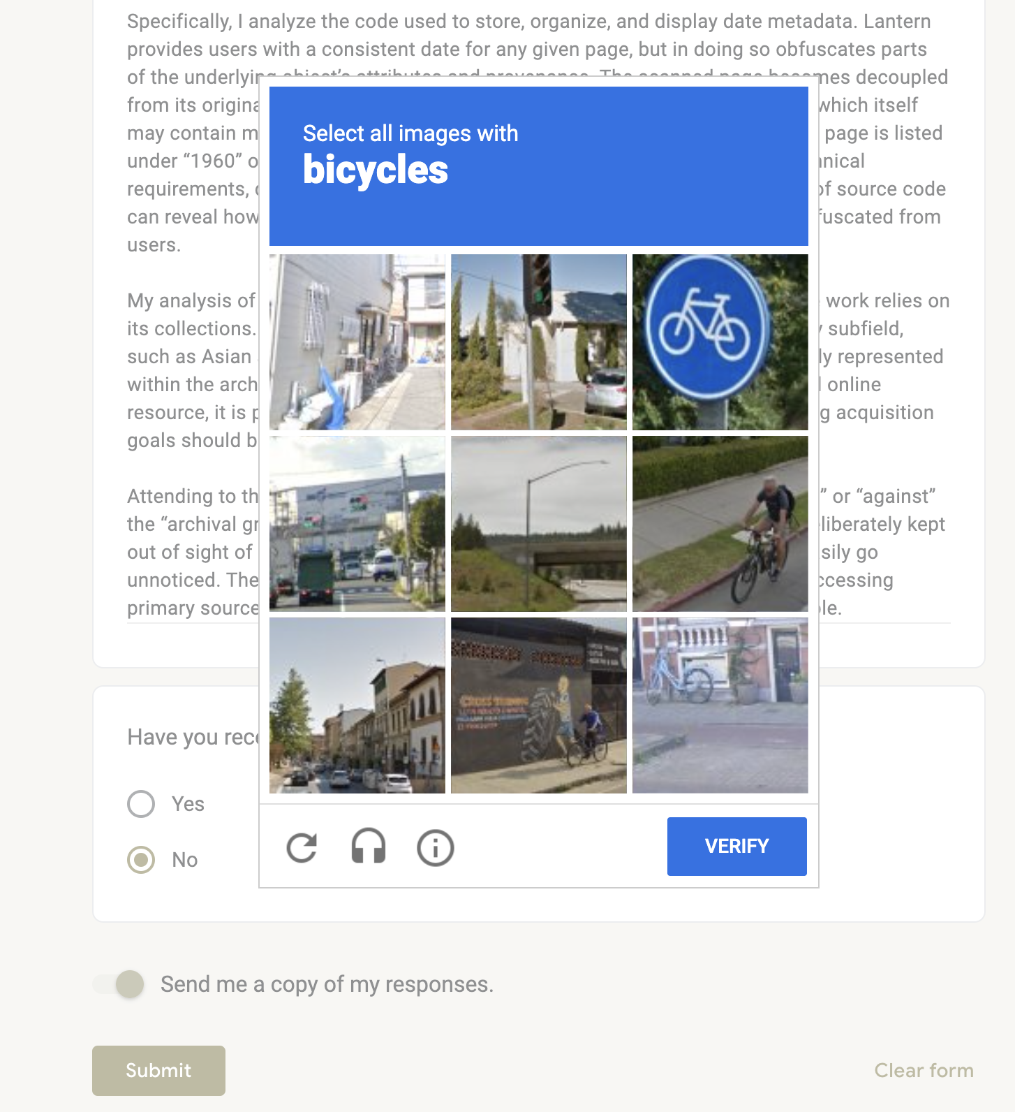 Challenge description: Logo at bottom of page. On form submission, I received a challenge overlay asking me to identify bicycles in an image.