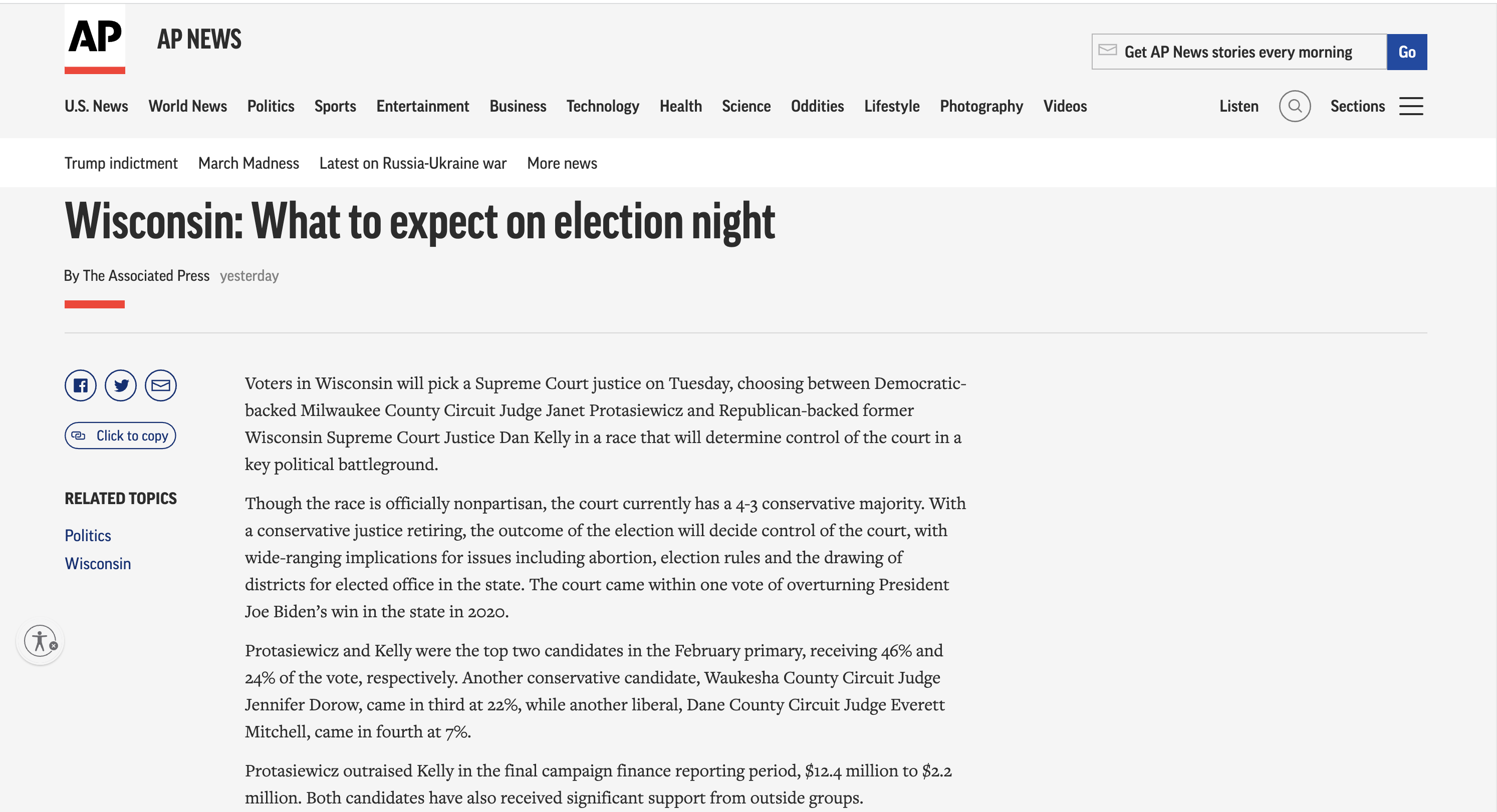 Website url: https://apnews.com/article/wisconsin-supreme-court-election-kelly-protasiewicz-c2c54f51865a20dc10aa7ea63b414ea3