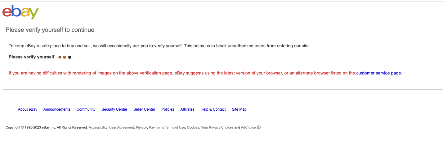 Additional description: Took a while for the page to load - unclear if it was checking other things in the background before rendering the reCAPTCHA. Additionally, the footer has some interesting notes about how if you're unable to solve the challenge, you just need a new browser--as if it's a technical problem and not an issue of accessibility.